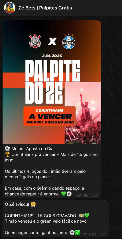 Zé do Gol é uma comunidade brasileira de palpites de futebol. Compartilhamos análises e palpites todos os dias de forma gratuita para nossa comunidade no Telegram.